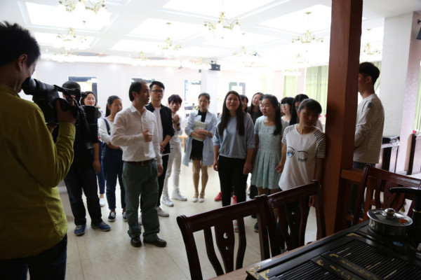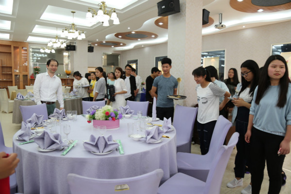 在旅游管理實訓中心,講解老師向學生介紹了旅游實景沙盤并帶領大家參觀了中西餐實訓室和茶藝實訓室。在中餐實訓室,向學生介紹了中西餐的基本操作技能以及區別,用餐禮儀和餐飲文化。在茶藝實訓室,簡要介紹了茶具的使用和茶葉的識別與泡制等。在調酒實訓室,調酒師向觀摩學生介紹了各式酒具的功能及用途、表演了各式雞尾酒的調制方法,學生饒有興致的進行了現場學習。