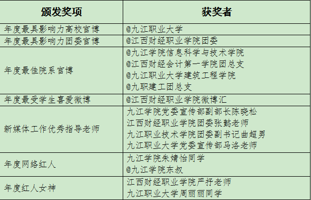 晚會對微博年度大數(shù)據(jù)、九江高校微博發(fā)展趨勢進行解析,通過線上投票選舉產(chǎn)生了九江高校各獎項獲得者,以視頻形式展現(xiàn)了校園中涌現(xiàn)出的熱點事件,對校園微博紅人和先進集體進行了表彰,以下個人和集體獲獎: