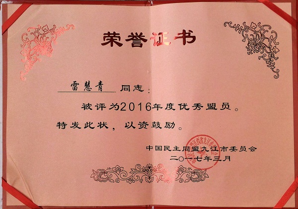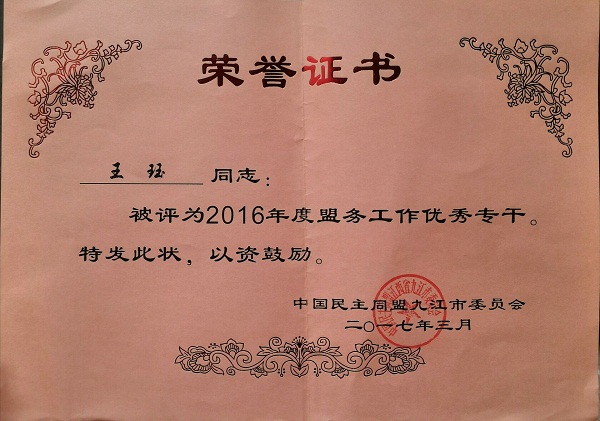 王玨和雷慧青還獲得了民盟九江市委頒發的年度先進個人的榮譽證書。