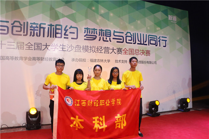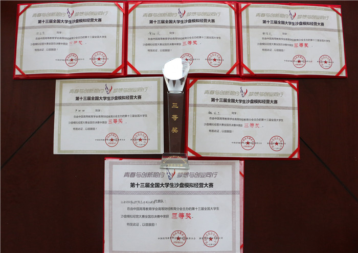 2017年10月28日至29日,由中國高等教育學會高等財經教育分會主辦、福建農林大學承辦、新道科技股份有限公司提供技術支持的第十三屆全國大學生沙盤模擬經營大賽全國總決賽在福建福州隆重舉辦。經過層層選拔,我校選派的由14級會計學2班涂亞東、謝寶文、尹細細,15級會計學2班魏運蘭、黃細鳳五位同學組成的本科代表隊在本科部朱順熠老師的指導下奮力比拼,激烈角逐,從全國121所高校的128支代表隊脫穎而出榮獲全國總決賽團體三等獎。