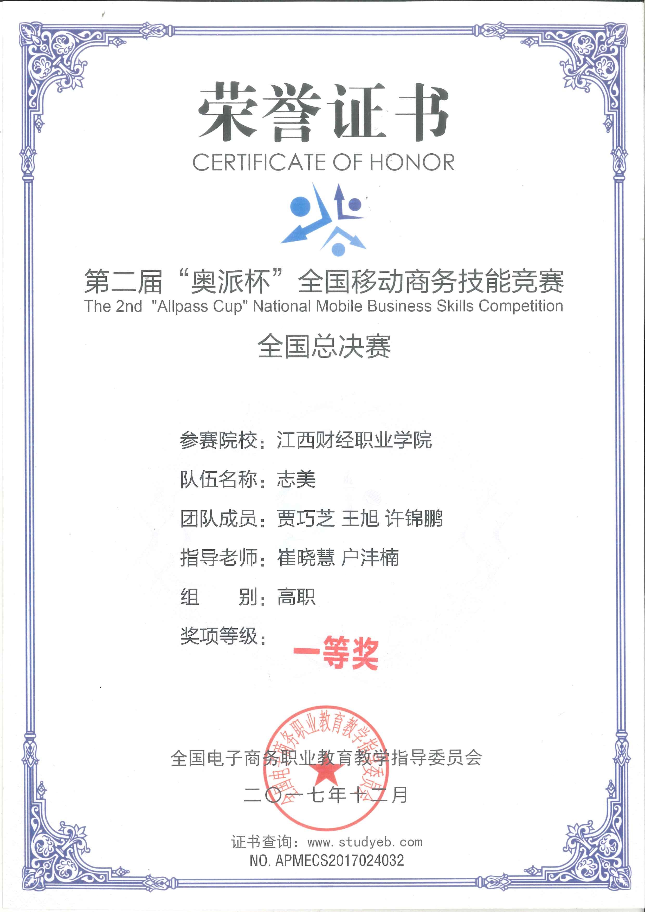 12月2日,2017年“奧派杯”全國移動商務技能競賽全國總決賽在南京信息職業技術學院舉行。來自全國23個賽區的84支隊伍同臺競技,展開了激烈競爭。由我校經濟貿易學院選派的志美團隊在大賽中發揮出色,比賽成績全國第三,榮獲高職組全國一等獎(江西省8支參賽代表隊中最高獎項),志合團隊榮獲團體二等獎,崔曉慧、戶灃楠、陳潔等榮獲優秀指導教師。
