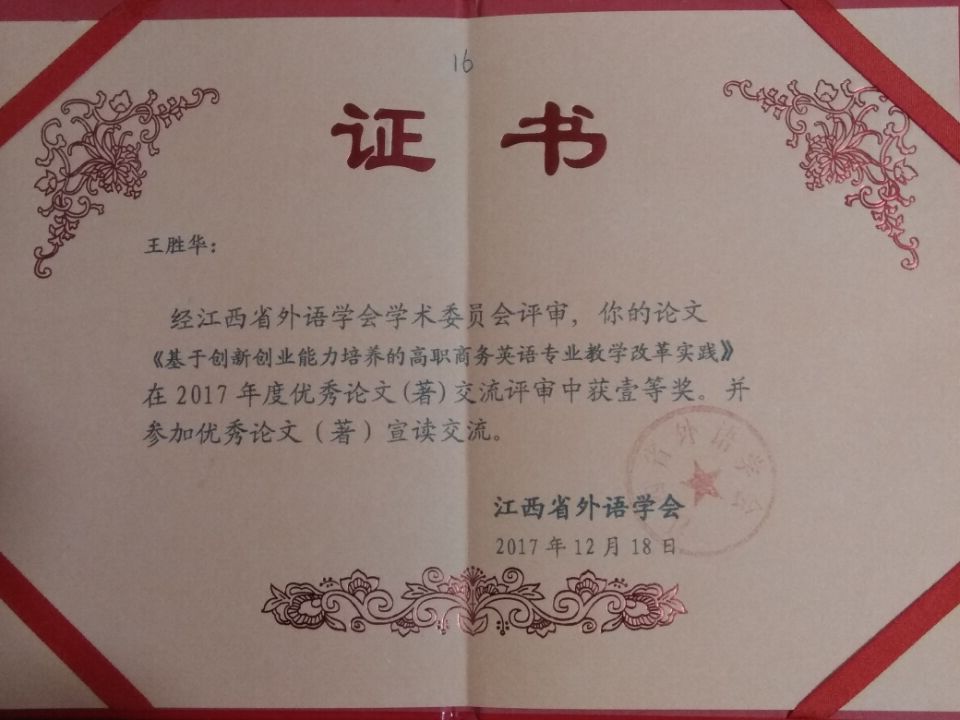 省外語學(xué)會會長做學(xué)會工作匯報,黨支部書記宣讀了2017年學(xué)會優(yōu)秀論文獲獎名單,并為獲獎人員頒發(fā)獲獎證書。論文《基于創(chuàng)新創(chuàng)業(yè)能力培養(yǎng)的高職商務(wù)英語專業(yè)教學(xué)改革實踐》獲得一等獎,這是繼去年外國語學(xué)院參會論文獲得該論壇一等獎后再次獲此殊榮。論文《以“能力為本位”的BTEC課堂模式研究與實踐》和《翻轉(zhuǎn)課堂在高職公共英語教學(xué)中的應(yīng)用研究》獲得三等獎。這次獲獎是外國語學(xué)院長期重視教育教學(xué)研究的成果,進(jìn)一步提升了外國語學(xué)院在江西省外語界的聲譽和影響力。