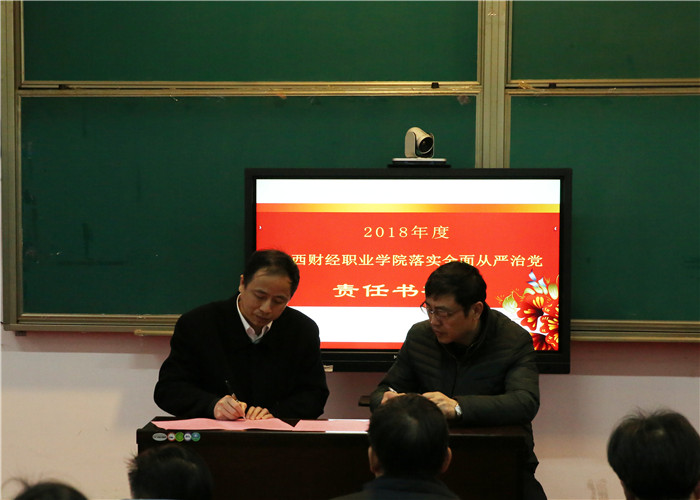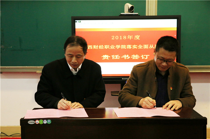 為深入貫徹十九大關(guān)于全面從嚴(yán)治黨總體要求,認(rèn)真落實(shí)中紀(jì)委十九屆二次全會(huì)、江西省紀(jì)委十四屆三次全會(huì)精神,強(qiáng)化領(lǐng)導(dǎo)干部全面從嚴(yán)治黨責(zé)任意識(shí),落實(shí)黨風(fēng)廉政建設(shè)“兩個(gè)責(zé)任”,著力從嚴(yán)治黨、從嚴(yán)治校,3月22日下午,江西財(cái)經(jīng)職業(yè)學(xué)院黨委書記林火平與班子成員、中層領(lǐng)導(dǎo)干部分別簽訂了《2018年度落實(shí)全面從嚴(yán)治黨主體責(zé)任書》,黨委副書記、紀(jì)委書記曹銳與中層領(lǐng)導(dǎo)干部分別簽訂了《2018年度落實(shí)全面從嚴(yán)治黨監(jiān)督責(zé)任書》。