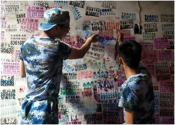 活動中,志愿者們提著水桶,拿著小鏟、墻刷等一些專用工具到各自負責的區(qū)域進行清除,有的用手撕,有的用小鏟子鏟,有的用涂料刷。志愿者們不怕臟不怕累,用鏟刀、墻刷等工具,對小區(qū)樓棟外墻、樓道及樓道扶手上的小廣告進行了清理,對粘貼牢固不易清理的小廣告,志愿者們用手一點一點將其撕離墻體,對噴涂式的小廣告用涂料進行覆蓋。經(jīng)過志愿者們的努力,社區(qū)的亂張貼現(xiàn)象有了明顯的改善。