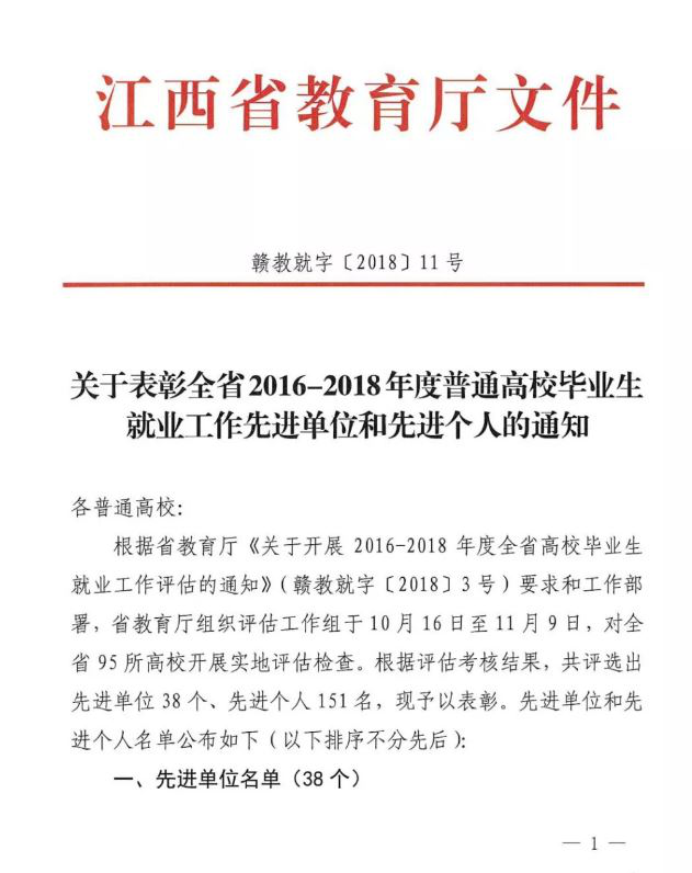 近日,從江西省教育廳《關于2016-2018年度全省普通高校畢業生就業工作評估結果的通報》(贛教就字[2018]10號)、《關于表彰全省2016-2018年度普通高校畢業生就業工作先進單位和先進個人的通知》(贛教就字[2018]11號)中獲悉,我校在江西省2016-2018年度普通高校畢業生就業工作評估中被評為“優秀等級學校”,并榮獲“就業工作先進單位”稱號,這也標志著我校連續15年獲此殊榮。
