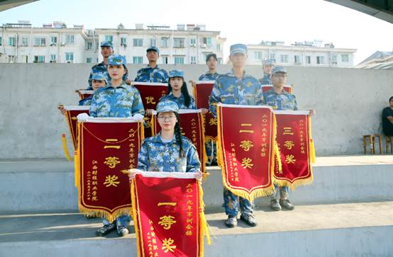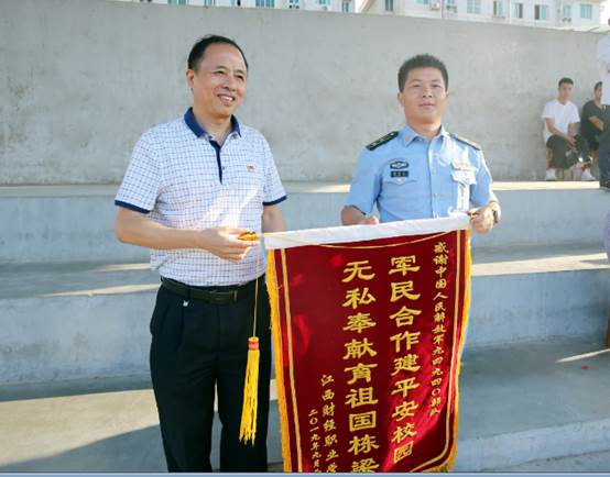 閱兵式后,林火平代表學校向中國人民解放軍某部贈送了錦旗以表感謝,感謝部隊對我校軍訓工作的大力支持。校領導和部隊首長還為軍訓優勝隊伍頒發了錦旗。
