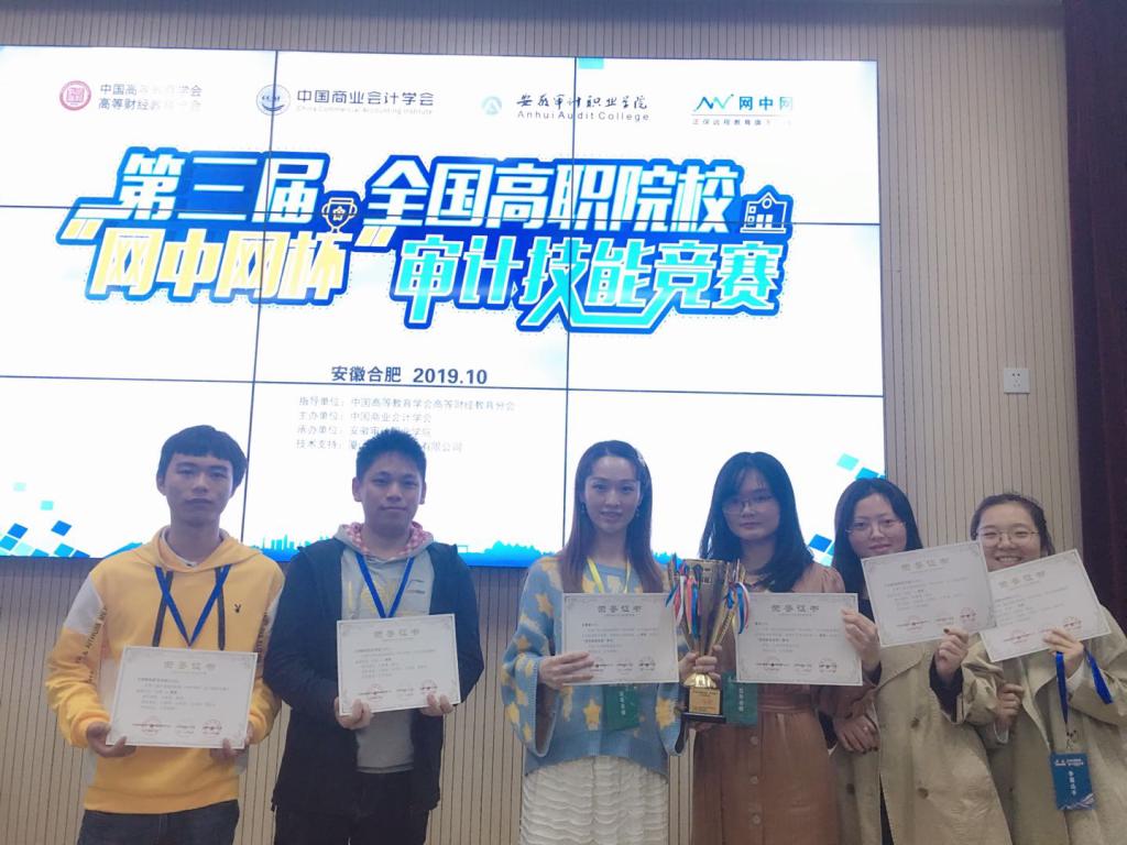 2019年10月26日,由中國高等教育學會高等財經教育分會主辦、安徽審計職業學院承辦的2019年第三屆全國高職院校“網中網杯”審計技能競賽在安徽審計職業學院舉行。來自全國各地的35支代表隊參加了本次賽事。江西財經職業學院會計第二學院由吳菁菁、黃迎兩位指導老師帶領著王璐瑤、付澤巖、汪冰琪、鄭旺亞四位同學參賽。經過激烈的角逐,我校代表隊在比賽中脫穎而出,以總分637.65分的優異成績位列全國第一,榮獲一等獎,吳菁菁、黃迎兩位老師榮獲“優秀指導教師”稱號。其中,審計理論單項比賽全國140名選手僅有13名成績達到80分以上,我校四位同學均位列其中,王璐瑤同學高達89分;不僅如此,付澤巖同學在審計實務單項比賽中以90分的優異成績位列全國第一。