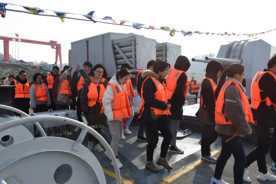 12月6日下午,近百名同學懷著新奇、激動的心情,分二批登上“九江艦”,在講解員的引導下,同學們觀看了艦貌,細看了雷達、火箭炮、艦長室、駕駛艙等,并認真聆聽講解員的講解。