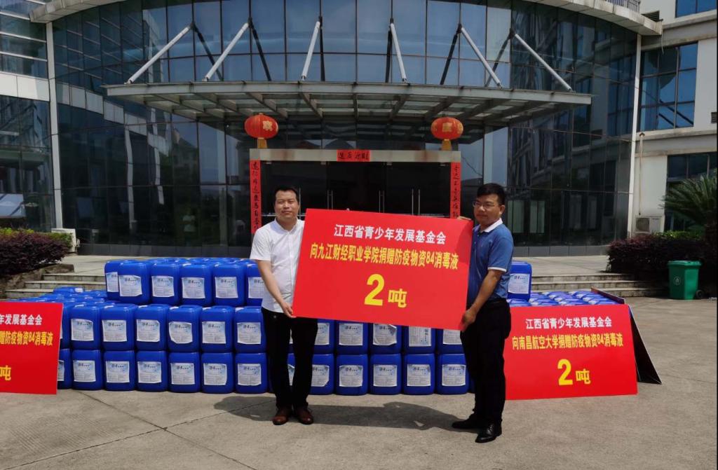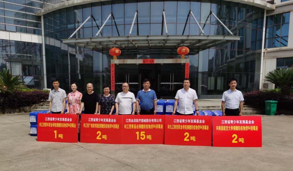 5月17日上午,在江西金洹醫療器械有限公司廠部舉行了捐贈儀式。由江西金洹醫療器械有限公司向江西省青少年發展基金會捐贈防疫物資84消毒液15噸,江西省青少年發展基金會現場向南昌航空大學、江西青年職業學院、江西財經職業學院、江西廣電教育集團等院校轉捐1至2噸不等的84消毒液,其中我校接受捐贈84消毒液2噸。