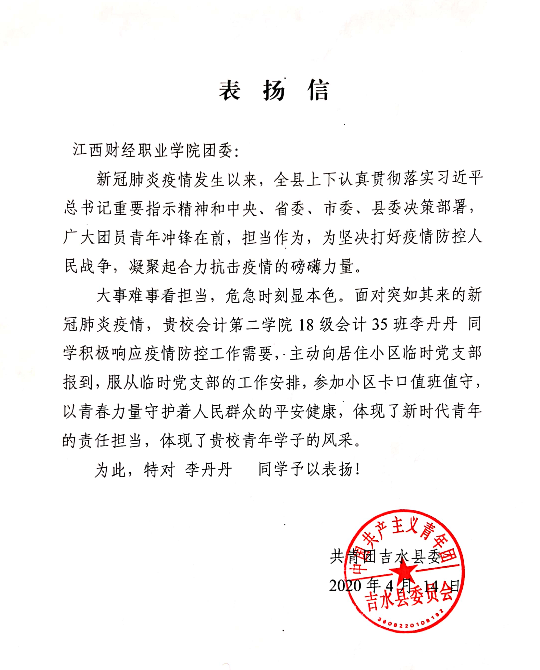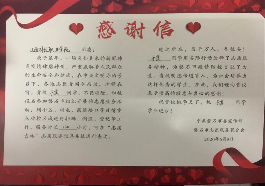 疫情發生以來,我校收到中共磐石市委宣傳部、共青團瑞昌市委、共青團都昌縣委、共青團吉水縣委、新巴爾虎左旗農牧業科技執法大隊等地發來的感謝信、致謝函和表揚信。信中對我校學工處江川老師、會計第一學院于淇同學、會計第二學院李丹丹同學、信息工程學院楊福靈同學、財稅金融學院蘇晨同學等青年志愿者積極主動加入疫情防控志愿服務隊伍,為當地疫情防控工作貢獻青春力量提出了感謝和表揚,并對我校立德樹人、人才培養建設的高度給予肯定。