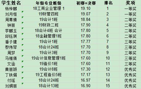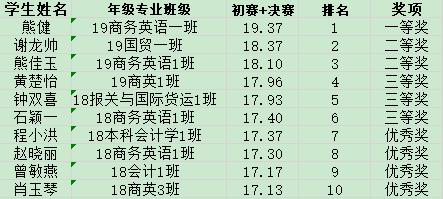 經(jīng)過兩個環(huán)節(jié)的角逐,公外組由來自18工商企業(yè)管理1班的楊梓鵬和19財務(wù)管理4班的劉月恒勇奪一等獎。涉外本科組的一等獎是由19商務(wù)英語1班的熊健同學(xué)獲得。具體獲獎名單如下。