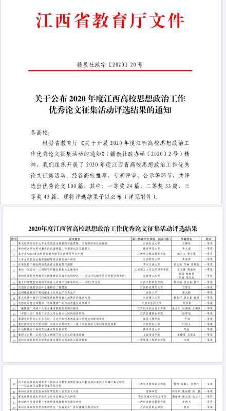 近日,2020年度江西省高校思想政治工作優秀論文征集活動評選結果公布,我校教師黃亮的論文《新時代高職院校思政教師隊伍“雙融雙優”共同體建設路徑研究》榮獲一等獎。