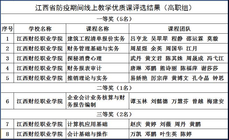 日前,從江西省教育廳網站傳來喜訊,在“全省教育系統防疫期間線上教學優質課評選”活動中,我校喜獲豐收,推薦的課程共有8門獲獎,其中一等獎5門,二等獎1門,三等獎2門,一等獎和獲獎總數均位列全省高職院校首位。