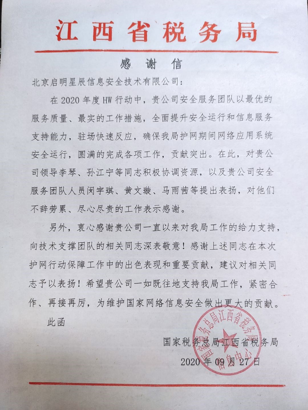2020年9月,信息工程學院校企合作單位北京啟明星辰信息安全技術有限公司收到江西省稅務局發來的感謝信,感謝企業領導及技術人員在2020年度HW行動中,給予江西省稅務局最優的服務質量、最實的工作措施,全面提升了稅務系統安全運行和信息服務支持能力,確保了稅務局網絡應用系統安全運行。