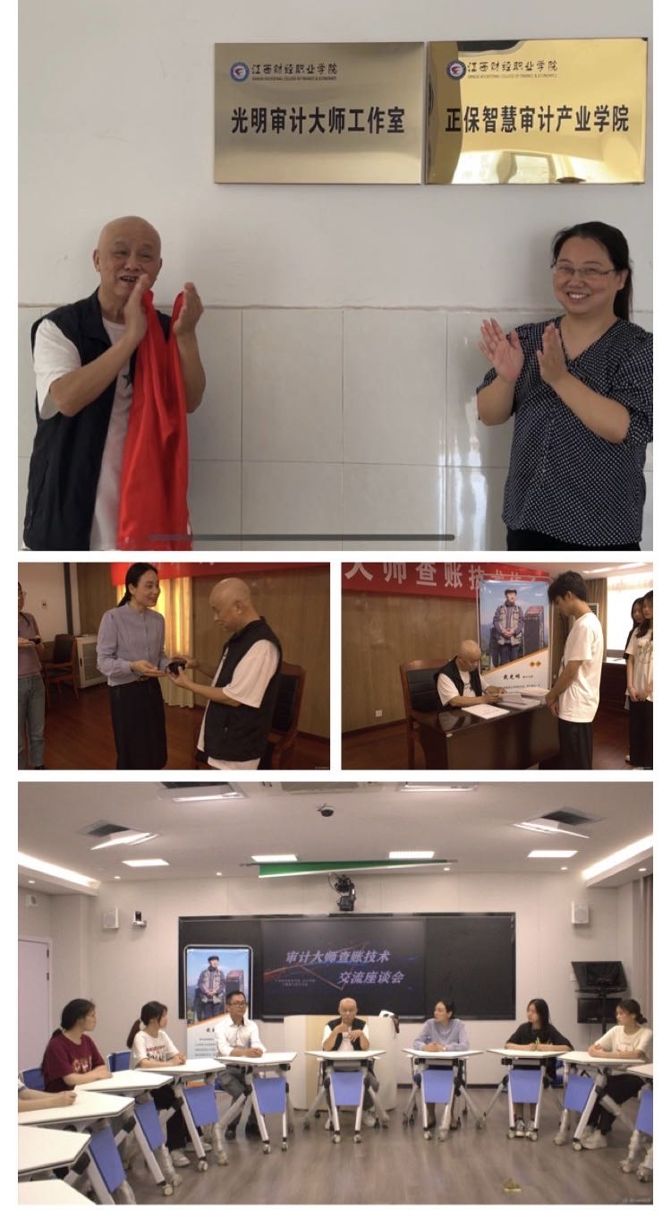 活動期間,審計專業(yè)教師帶領(lǐng)學(xué)生進行了查賬技術(shù)傳承儀式。戴光明老師熱情地為工作室題字“光明審計大師工作室”;給師生們贈書,希望同學(xué)們努力學(xué)習(xí),提高審計技能和本領(lǐng)。最后,審計專業(yè)教師團隊和學(xué)生代表與行業(yè)審計大師們就“錯賬識別和查賬技術(shù)”與“實踐教學(xué)模式”展開了深入的交流和討論。