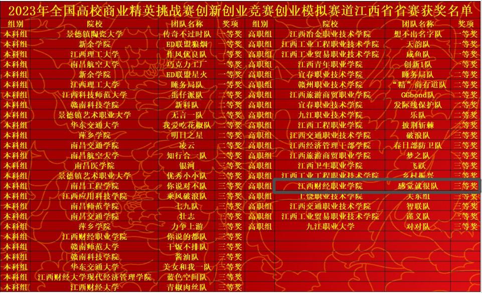 2023年全國高校商業(yè)精英挑戰(zhàn)賽創(chuàng)新創(chuàng)業(yè)競賽創(chuàng)業(yè)模擬賽道江西省省賽(高職組)于7月2日在南昌舉行。由工商管理學院曹玉敏老師、袁晨釗老師指導的饒賽蓮、黃錦玲團隊獲團體三等獎。