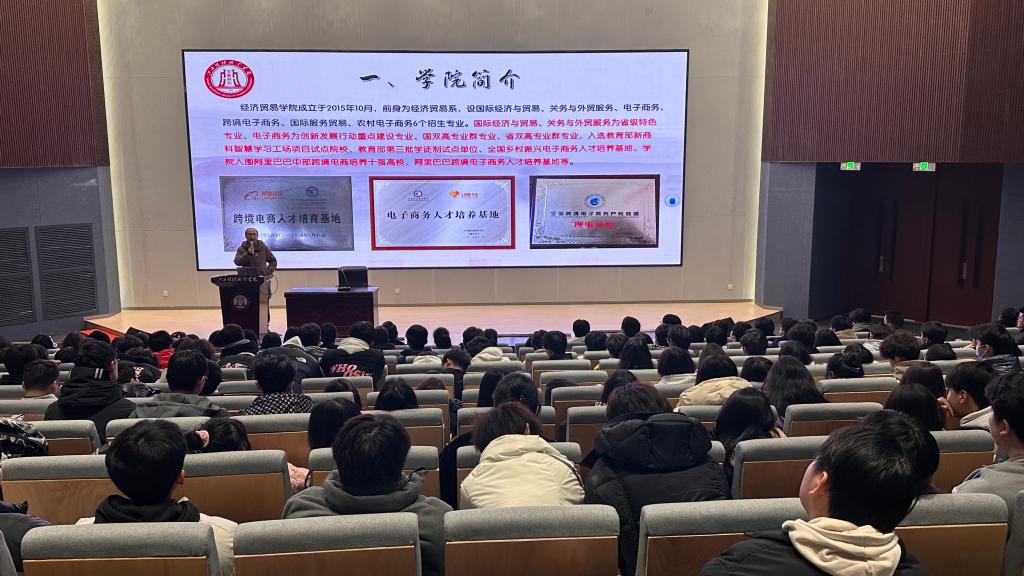 下午在行政樓一樓報告廳,肖細根院長從學校簡介、歲月長河、校園文化、教育教學、校友風采5個方面為同學們做校情、校園文化分享,崔曉慧副院長、電商教研室主任戶灃楠、黨政辦主任杜波分別介紹了經貿學院院情、成果及文化特色;專業概況、就業前景;學生工作等。陳瀅泓等學生代表介紹了學院社團特色、文化等。