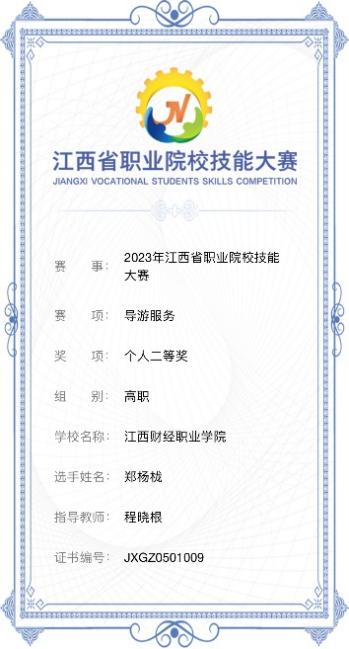近日,江西省職業(yè)院校技能大賽高職組“導游服務”賽項在江西旅游商貿(mào)職業(yè)學院落下帷幕。本次大賽由省教育廳主辦,江西旅游商貿(mào)職業(yè)學院承辦,來自全省的18支參賽隊32名選手同臺競技。經(jīng)過全天緊張激烈的角逐,由我校文化旅游學院程曉根老師指導,鄭楊櫳、黃婷玉兩位同學組成的代表隊取得優(yōu)異成績,榮獲個人二、三等獎。
