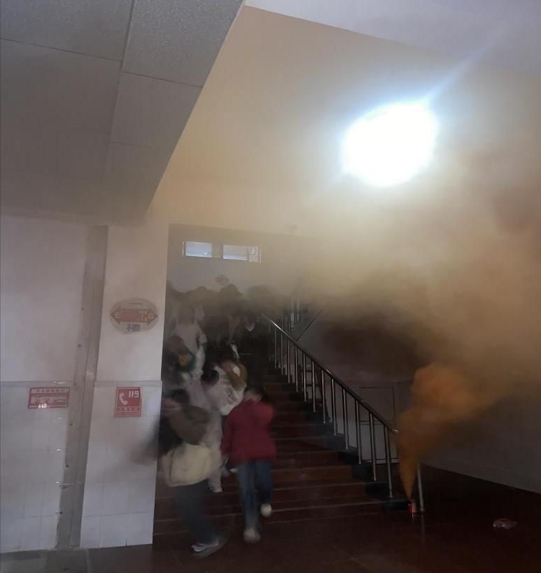 最后,講座由室內轉向室外,丁老師針對學校防火特點,介紹了校園中可能存在的火災隱患,模擬面對火災現場,學生們該掌握哪些逃生技能,如何保持冷靜迅速采取有效自救措施。