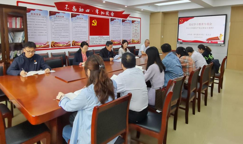 4月26日,為深入推動廣大黨員、干部強化遵守紀律自覺,從嚴抓好黨的紀律建設,本科部(現代服務學院)黨總支在潯陽校區綜合樓918辦公室開展黨紀學習教育。黨總支書記高小蘭,黨總支副書記、副院長(主持工作)姜啟躍領學,教工支部、學生支部黨員以及部分入黨積極分子參與此次學習。