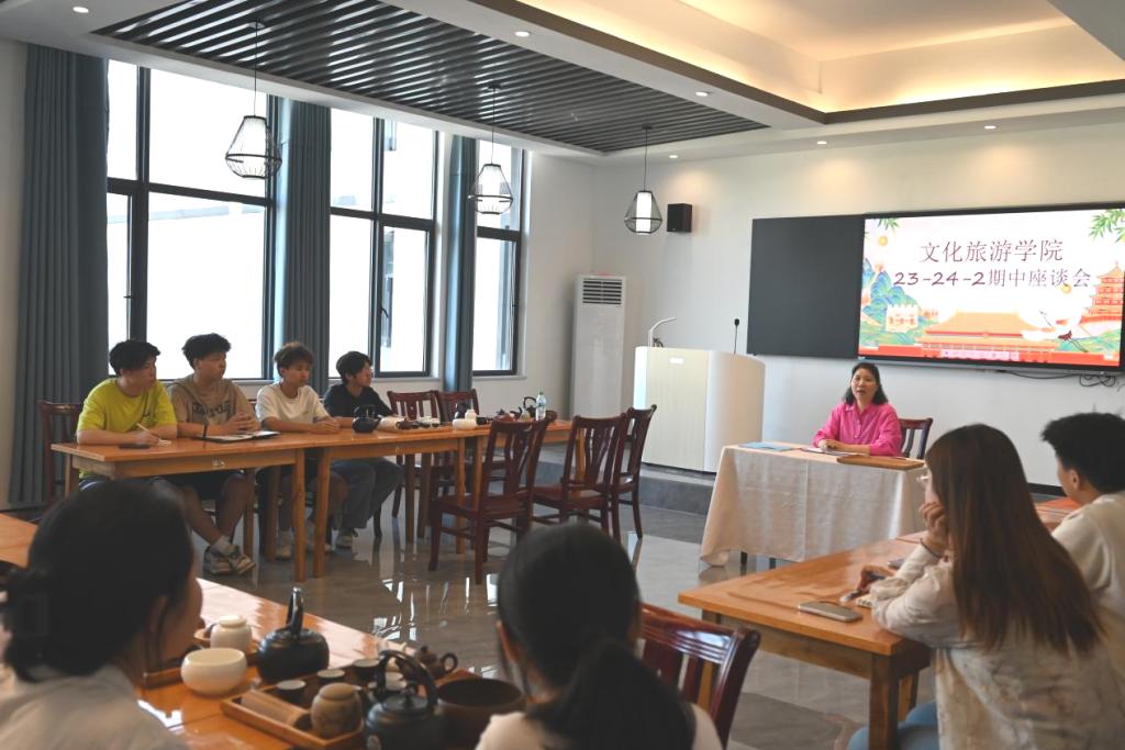 為進一步加強教學(xué)管理,了解本學(xué)期學(xué)生在教學(xué)運行及管理方面的建議和需求,共同促進教學(xué)質(zhì)量提升,5月28日下午,文化旅游學(xué)院在八里湖校區(qū)白鹿學(xué)館C404茶藝實訓(xùn)室開展2024春季學(xué)期期中座談會,座談由文化旅游學(xué)院負責(zé)人易嬌艷主持,22、23級各班學(xué)生代表參會。