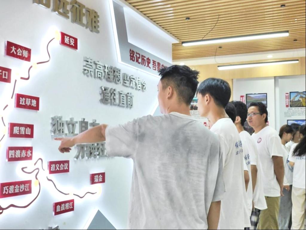 當天上午,實踐隊成員們首先參觀了展館一樓的“井岡山精神”“偉大長征精神”“延安精神”“西柏坡精神”“改革開放精神”及“抗洪精神”六個篇章。通過指導老師的講解以及在數(shù)字科技手段的生動演繹下,一幅幅生動的戰(zhàn)役場景躍然眼前,一個個浴血奮戰(zhàn)的畫面震撼心靈。隊員們仿佛穿越時空,置身于那段艱苦卓絕的長征歲月,深刻感受到了偉大建黨精神的不朽。