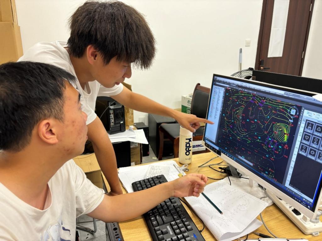 圖為:“潯夢楊洲”社會實踐隊成員交流合作修改鄉村薪火園圖。