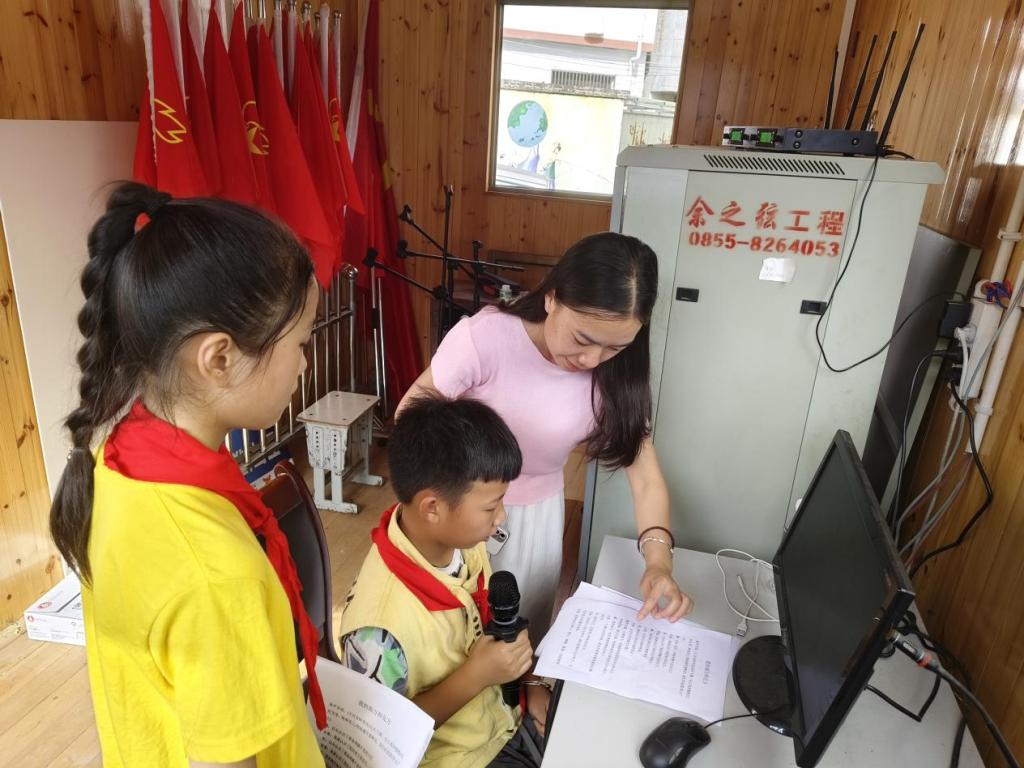 舟溪小學(xué)廣播站的播音員正在深情朗誦著詩(shī)歌《我的南方和北方》。吳興菊是學(xué)校廣播站的指導(dǎo)老師,看見我們來(lái),介紹著這兩位五年級(jí)的孩子:“這是我們廣播站的王牌呢!”