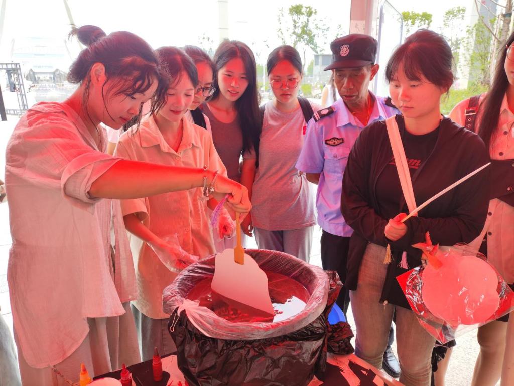 漆扇是一種以扇子為載體,運用國家級非遺漆染工藝手工染制而成的藝術(shù)品。活動現(xiàn)場人頭攢動,氣氛熱烈。在專業(yè)人員的講解與指導(dǎo)下,同學(xué)們學(xué)習(xí)漆藝中的“飄漆”技法,利用漆不溶于水的特質(zhì),以點、甩、彈、劃等手法,在水面繪出圖案效果。由于漆扇“一半人為,一半天成”的特點,在活動中同學(xué)們紛紛制作出屬于自己的獨一無二的漆扇,并親身感受到中國傳統(tǒng)工藝美學(xué)的魅力。漆扇在手中輕輕搖曳,同學(xué)們紛紛表示,參與此次活動不僅學(xué)到了漆扇制作的基本技巧,更深刻體會到了中華優(yōu)秀傳統(tǒng)文化的博大精深和獨特魅力。