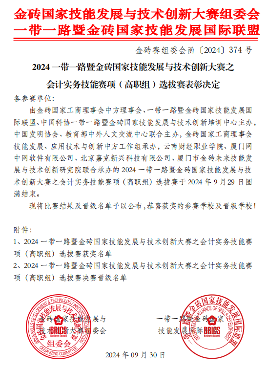 2024年9月29日,由金磚國家工商理事會、金磚國家技能發展國際聯盟主辦,教育部中外人文交流中心、中國發明協會聯合主辦,廈門網中網軟件有限公司技術支持的“2024年金磚國家技能發展與技術創新大賽之會計實務技能全國選拔賽”在線上成功落幕。當天來自全國的660多支高職隊伍參加了云端賽事,經過一天緊張激烈的比賽,由我校會計學院余暉文、黃玲老師指導,葉爾芳、劉厚松、宋悅和張奧同學組成的代表隊榮獲團體一等獎第1名的優異成績,吳玟、楊子璇、徐月蓉、黃榕組成的代表隊榮獲一等獎第4名,兩位教師榮獲“優秀指導教師”稱號。