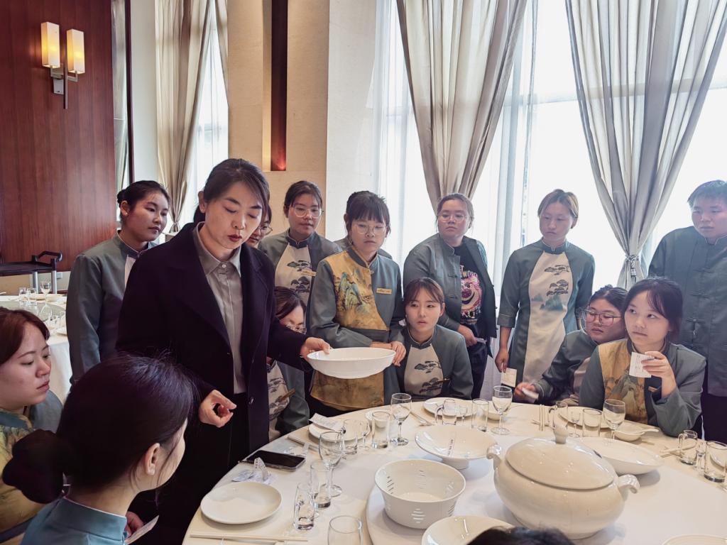 實踐期間,酒店圍繞會務(wù)服務(wù)核心技能開展系統(tǒng)培訓(xùn),培訓(xùn)內(nèi)容涵蓋托盤技巧、餐布鋪設(shè)、擺臺標(biāo)準(zhǔn)、酒水服務(wù)、菜品報備、撤盤規(guī)范等全流程。酒店管理人員通過嚴(yán)格的計分規(guī)則和實時反饋,幫助學(xué)生提升服務(wù)規(guī)范性。嚴(yán)謹(jǐn)?shù)墓芾眢w系、高標(biāo)準(zhǔn)的服務(wù)要求以及企業(yè)導(dǎo)師們的敬業(yè)精神,讓學(xué)生們深刻體會到行業(yè)一線對專業(yè)素養(yǎng)的重視。