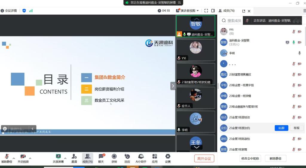 10月15日,財稅金融學院聯合安徽迪科數金科技有限公司,通過騰訊會議平臺面向2026屆全體畢業生開展線上招聘宣講會,學院23級全體學生和班主任、輔導員參加了宣講會。