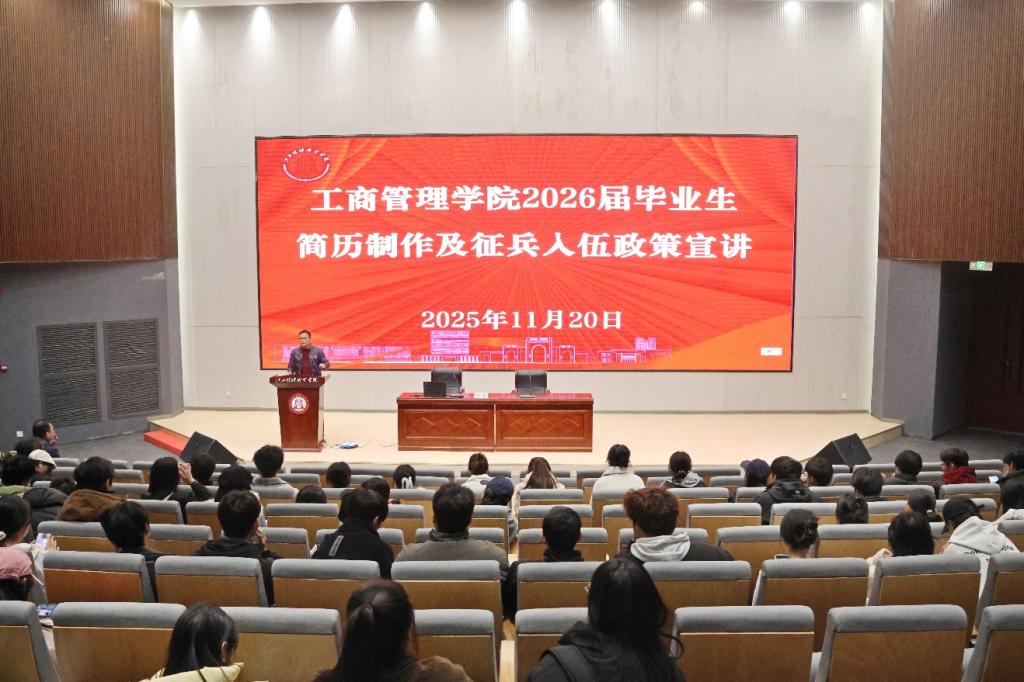 為扎實(shí)推動(dòng)2026屆畢業(yè)生就業(yè)工作,11月20日下午,工商管理學(xué)院于行政樓一號(hào)報(bào)告廳舉行2026屆畢業(yè)生簡(jiǎn)歷制作指導(dǎo)與征兵政策宣講會(huì)。學(xué)生工作處副處長(zhǎng)劉磊主講,學(xué)院領(lǐng)導(dǎo)、相關(guān)工作人員及畢業(yè)生200余人參加。