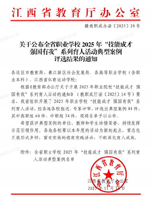 近日,江西省教育廳辦公室下發《關于公布全省職業學校2025年“技能成才強國有我”系列育人活動典型案例評選結果的通知》(贛教職成辦函〔2025〕20號),我校會計學院申報的《現場工程師實踐技能提升》項目成功入選。