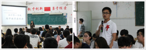 第二階段——學(xué)院教學(xué)座談會(huì)。5月4日下午會(huì)計(jì)第一學(xué)院在教學(xué)樓408教室組織召開了2015-2016學(xué)年第二學(xué)期期中教學(xué)座談會(huì),學(xué)院黨政班子領(lǐng)導(dǎo)和各教研室主任出席座談會(huì),來自學(xué)院14、15級(jí)各班120余名學(xué)生代表參加了座談會(huì)。座談會(huì)上,與會(huì)學(xué)生代表主要圍繞學(xué)院目前在課堂教學(xué)、教學(xué)安排、教學(xué)條件、教學(xué)管理等幾個(gè)方面存在的問題,積極發(fā)言,認(rèn)真反饋平時(shí)收集、了解到的教學(xué)相關(guān)的信息。學(xué)生代表們?cè)诎l(fā)言中對(duì)絕大部分教師的教學(xué)給予了充分的肯定,對(duì)個(gè)別教師在教學(xué)過程中存在的不足提出了意見和建議,同時(shí)也對(duì)學(xué)院教學(xué)條件、教學(xué)管理方面給出了建議。