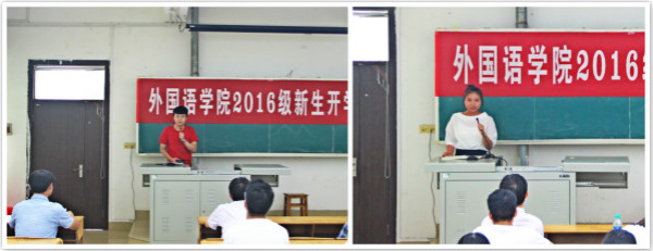 外國(guó)語(yǔ)學(xué)院學(xué)生會(huì)主席程進(jìn)軍和新生代表2016級(jí)商務(wù)英語(yǔ)2班田小鳳分別作了發(fā)言。