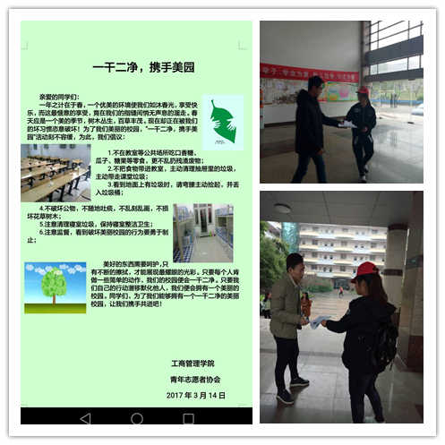 美化校園環(huán)境,從你我做起,從文明習慣養(yǎng)成做起。在清掃教學樓后,志愿者們手持一張事先精心制作的、標題為“一干二凈,攜手美園”的宣傳單,熱情地向同學們分發(fā),積極呼吁更多的同學加入到校園環(huán)境保衛(wèi)活動中。