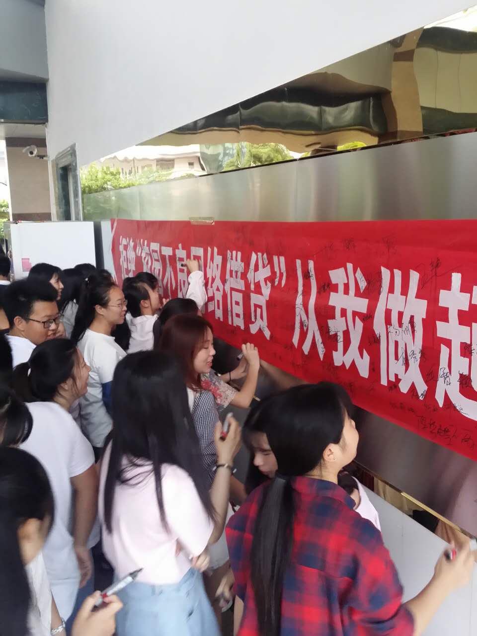 盧書(shū)記首先做了主旨講話,他要求同學(xué)們看清網(wǎng)絡(luò)貸款的真實(shí)危害性,樹(shù)立勤儉意識(shí),養(yǎng)成文明、健康的生活習(xí)慣,要合理消費(fèi)、理性消費(fèi)、科學(xué)消費(fèi);不參與、不宣傳校園貸違規(guī)違法活動(dòng);不鼓動(dòng)、不脅迫他人在校園貸中借款;不張貼、不轉(zhuǎn)發(fā)校園貸違規(guī)違法信息;不冒用、不頂替他人身份進(jìn)行校園貸款。全體同學(xué)在深刻了解了不良網(wǎng)貸的嚴(yán)重危害后,紛紛在宣傳橫幅簽上名字,表明自己堅(jiān)決抵制不良網(wǎng)貸的堅(jiān)定態(tài)度,呼吁更多的學(xué)子拒絕校園不良網(wǎng)貸。