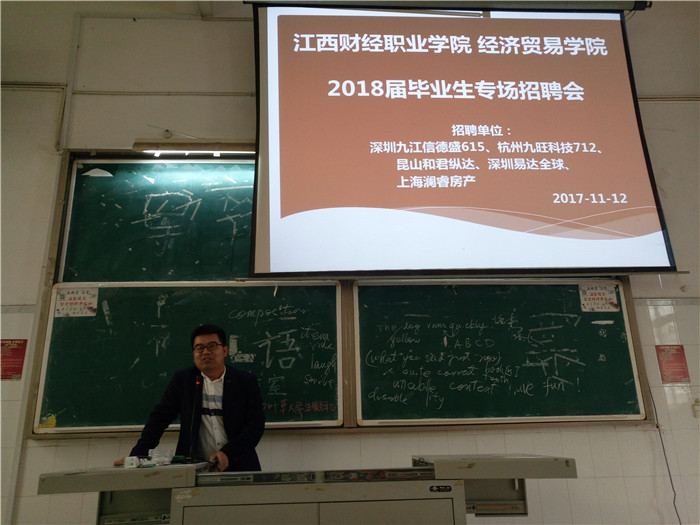 經(jīng)貿(mào)學(xué)院但漢彪書記高度重視學(xué)生就業(yè),多方溝通考察,此次吸引了九江遠(yuǎn)洲國(guó)際大酒店、九江信華建國(guó)酒店、廬山豪生酒店和南昌萬(wàn)達(dá)酒店旗下3家酒店、杭州九旺科技、深圳易達(dá)全球、昆山和君縱達(dá)、深圳九江信德盛、上海瀾睿房產(chǎn)等11家企業(yè)來我院招聘,為我院學(xué)生提供了跨境電商、電子商務(wù)運(yùn)營(yíng)、市場(chǎng)營(yíng)銷、后備干部、酒店管理等崗位200余個(gè),起薪點(diǎn)2500-3500之間。