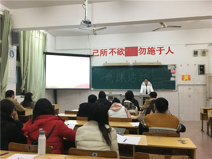 為深入推進“黨務知識”系列學習教育活動,落實“學習黨章,學習系列講話,做合格黨員”的要求,2017年12月12日晚7點整,在教學樓605教室,經濟貿易學院席穎釗老師為我院學生入黨積極分子包括高級培訓班和初級培訓班共40余人上了一堂關于“黨務知識學習——發展黨員程序”的黨課。
