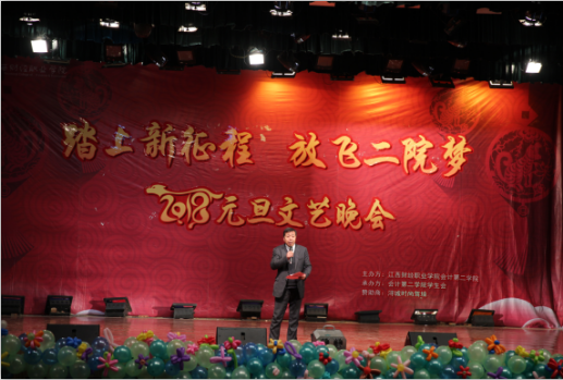 2017年12月24日晚7:00,會計第二學院在學校英才交流中心隆重舉辦以“踏上新征程,放飛二院夢”為主題的2018年元旦文藝晚會。會計第二學院黨總支書記譚國云致新年賀辭。