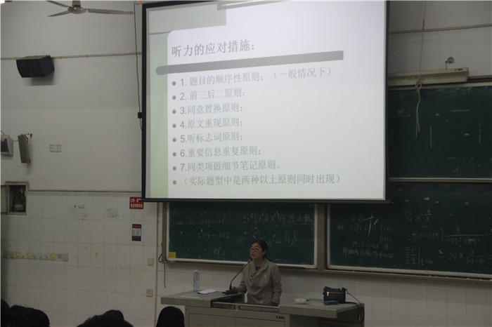 為幫助我校學(xué)生有效備考大學(xué)英語四級考試, 3月28日晚,外國語學(xué)院在教學(xué)樓608教室舉辦大學(xué)英語四級備考專題講座,外國語學(xué)院副教授宋學(xué)敏老師應(yīng)邀擔(dān)任主講。宋老師長期擔(dān)任本科班的英語教學(xué),教學(xué)效果好,深受學(xué)生喜愛。本次講座在學(xué)生中引起了熱烈反響,吸引了大量學(xué)生前來聽課,教室的過道和走廊都擠滿了學(xué)生。