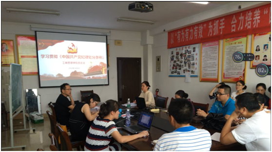 根據我校新學期教職工大會工作總體部署,為貫徹落實中共中央印發的《關于認真學習貫徹的通知精神》,工商管理學院于9月4日在綜合樓903會議室召開了新修訂的《中國共產黨紀律處分條例》專題學習會。會議由黨總支書記胡紅霞主持,學院全體教職工參加了學習。