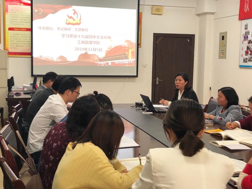 根據(jù)習(xí)近平總書記在“不忘初心、牢記使命”主題教育工作會議上的重要講話精神,為牢牢把握“不忘初心、牢記使命”主題,持續(xù)推進“兩學(xué)一做”學(xué)習(xí)教育常態(tài)化制度化,深入學(xué)習(xí)貫徹習(xí)近平新時代中國特色社會主義思想,工商管理學(xué)院于11月5日在綜903會議室組織全體教職工學(xué)習(xí)黨的十九屆四中全會精神,會議由黨總支書記胡紅霞同志主持。