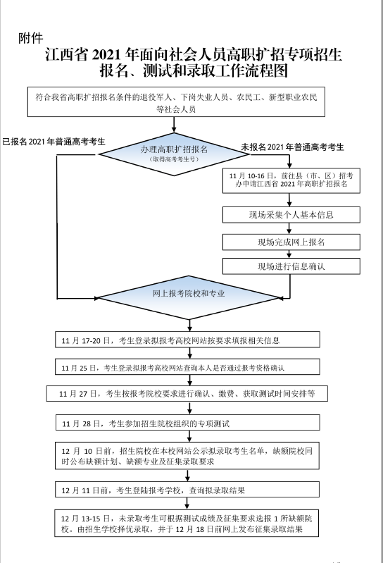 附件:江西省2021年面向社會人員高職擴招專項招生報名、測試和錄取工作流程圖