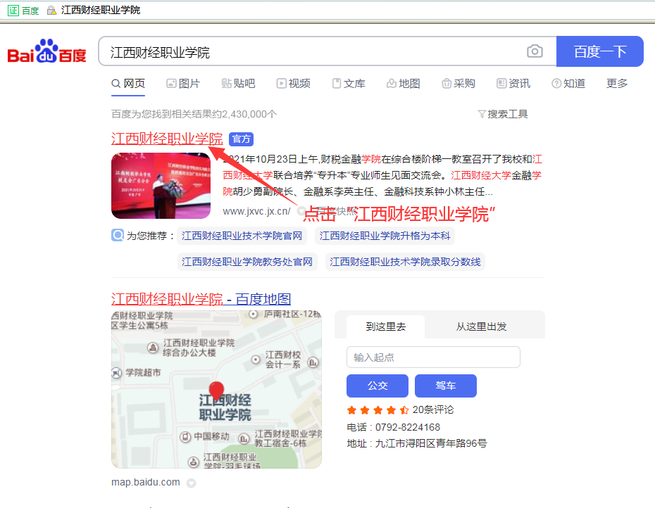 第一步、打開百度,搜索“江西財經職業學院”或輸入網址“http://m.m2yw.cn/”進入我校官網首頁。