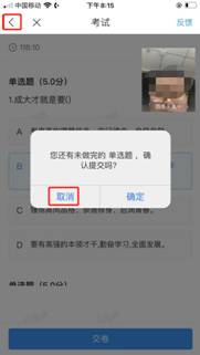 5.考生點擊最下方的“交卷”按鈕,若存在未作答題目,系統會有相關提示,請選擇“取消”并退回至整卷瀏覽補充作答,確認無誤后,并確認提交。