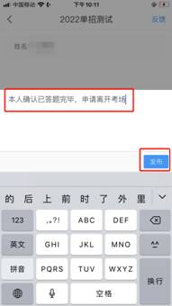 7.考生交卷成功,需點擊考試頁面右上角“反饋”按鈕,向監考老師發布:本人確認已答題完畢,申請離開考場,待收到監考老師從騰訊會議發出的確認離開回復后,方可退出騰訊會議。