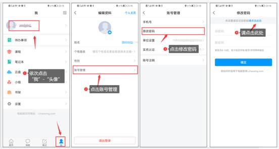 (2)登錄后,修改密碼操作如下圖。依次點擊“我”——個人頭像——“賬號管理”——“修改密碼”——“請點擊此處”,按提示修改密碼。