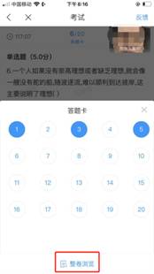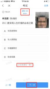 4.開始答題和交卷:每道題點擊自己選擇答案對應的選項即可(選項加深),點擊右下角“下一題”繼續作答;到最后一題時系統會提示“已經是最后一題了”,可點擊答題界面中間考試位置下方的“答題卡”區域進行整卷瀏覽,深色的為“已答試題”,淺色的為“未答試題”,可選擇任一未答題目來作答,也可選擇任一已答題目來修改答案,考生確定沒問題后可點擊“下一步”進行答題情況核查,左上角有本場考試倒計時。